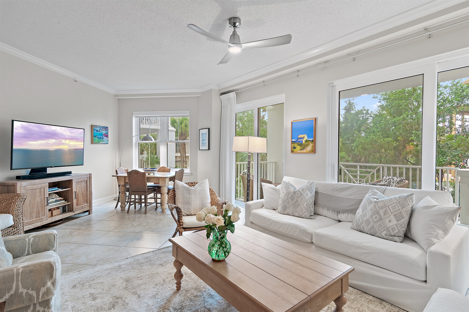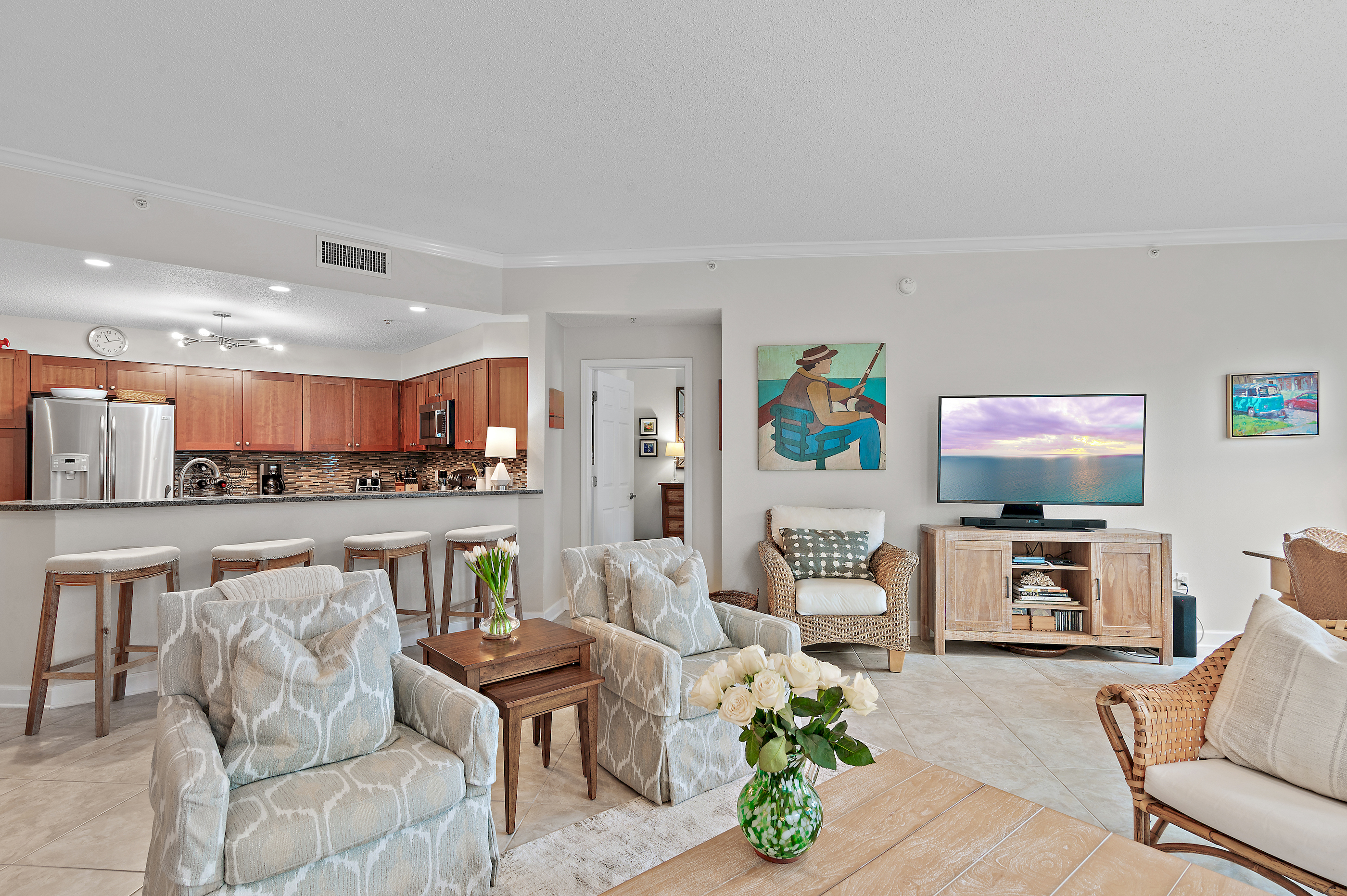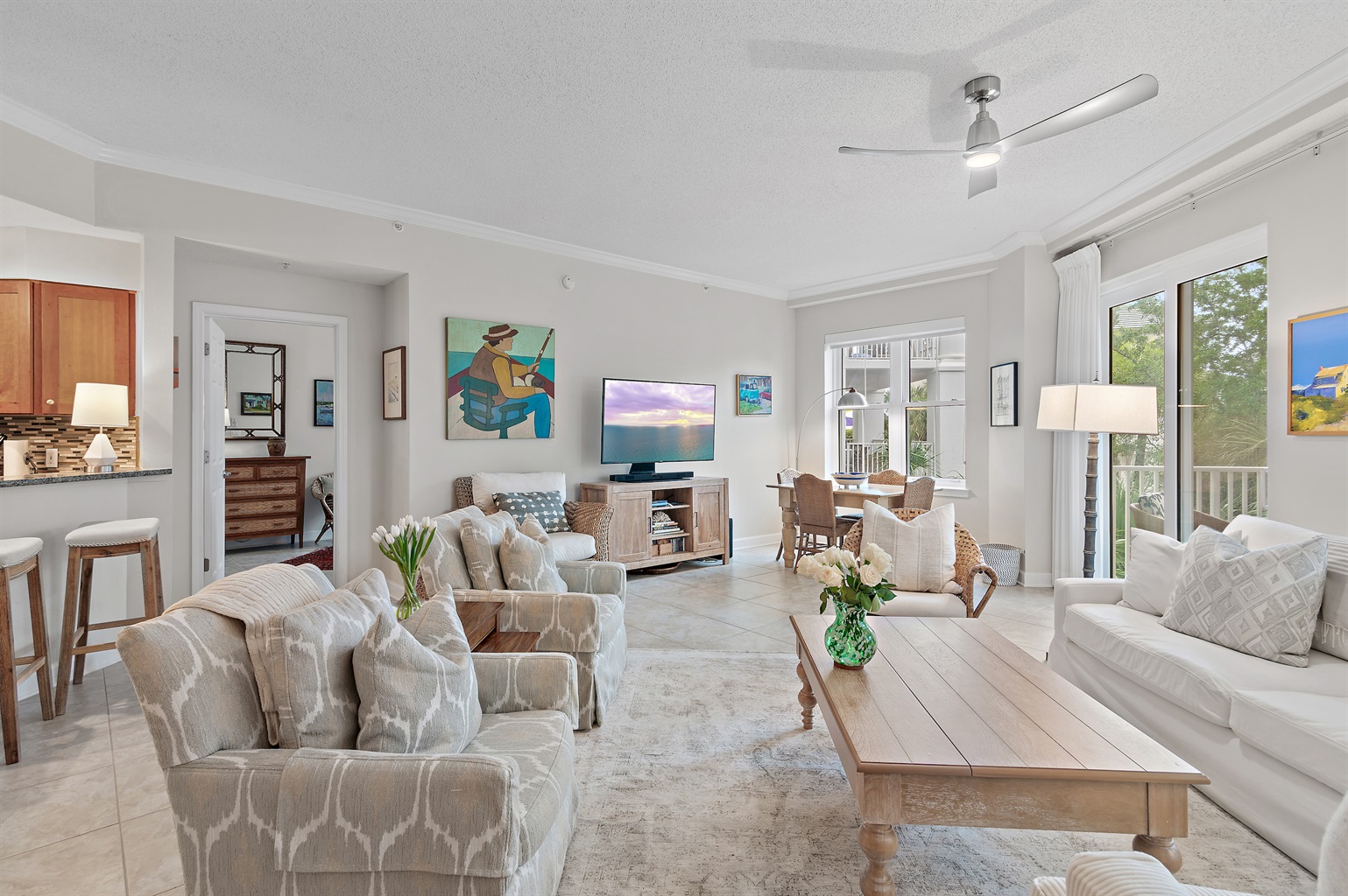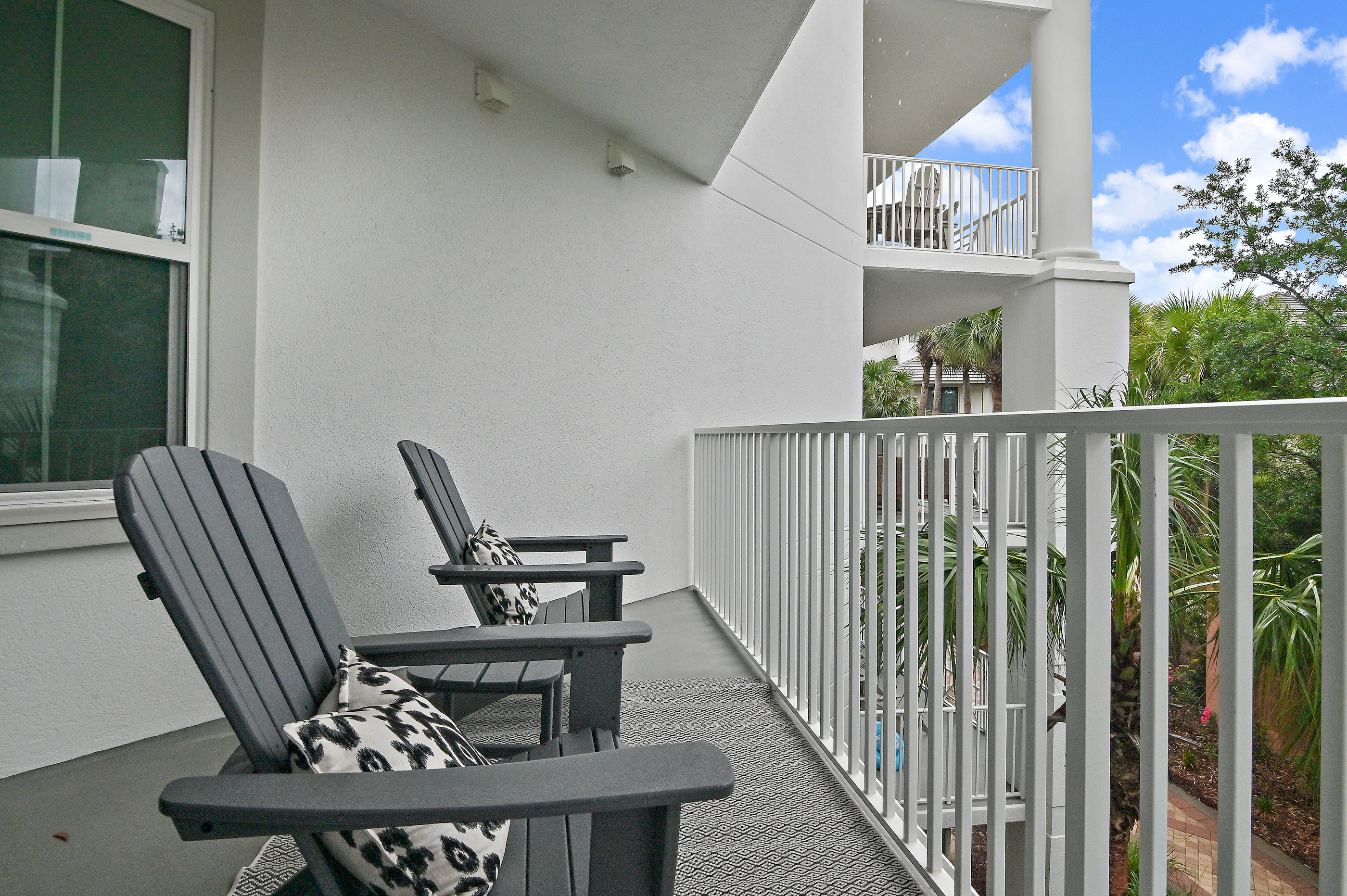 🏡 The Space 🛏️ Sleeps 7 comfortably • King Suite (private wing + jacuzzi tub + balcony) • 2 Queen Bedrooms • 1 Twin Bed 📐 Spacious Layout • 1,625 sq ft + large 400 sq ft balcony • Open living/dining with plenty of seating • Split floor plan = ideal privacy for families or couples 🌅 Outdoor Living • Main balcony with dining + lounge seating • Private balcony off primary suite