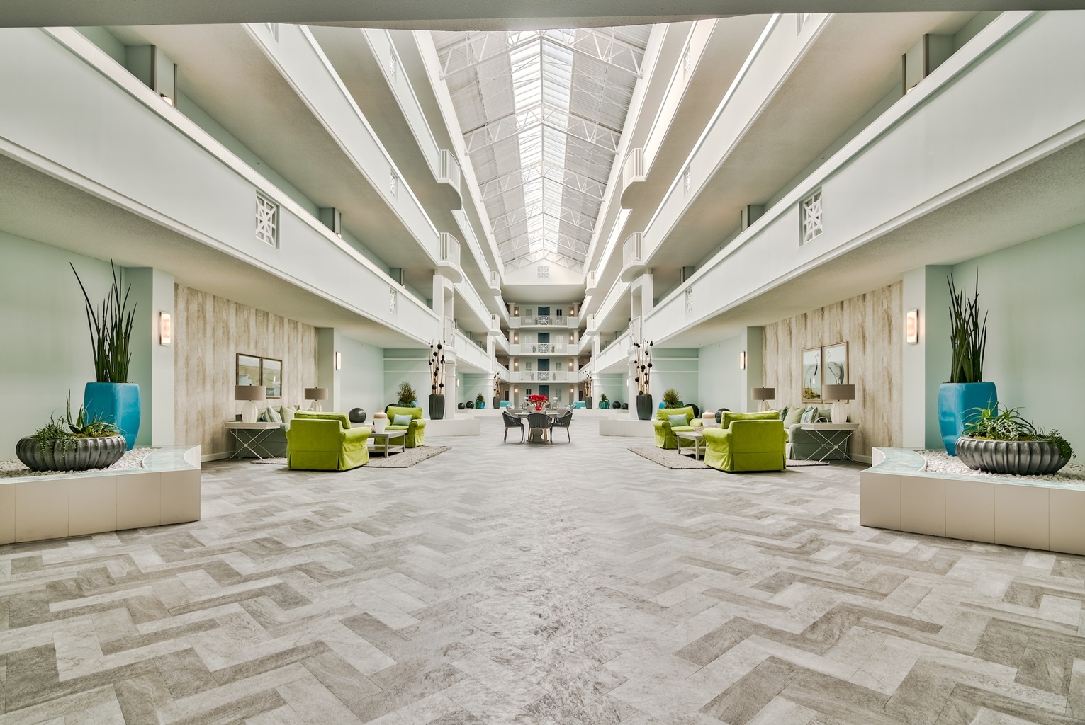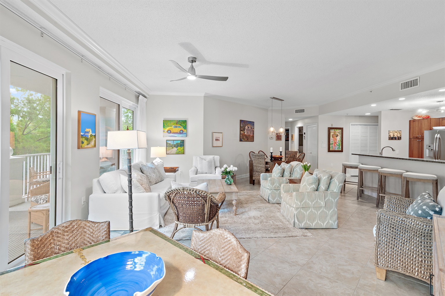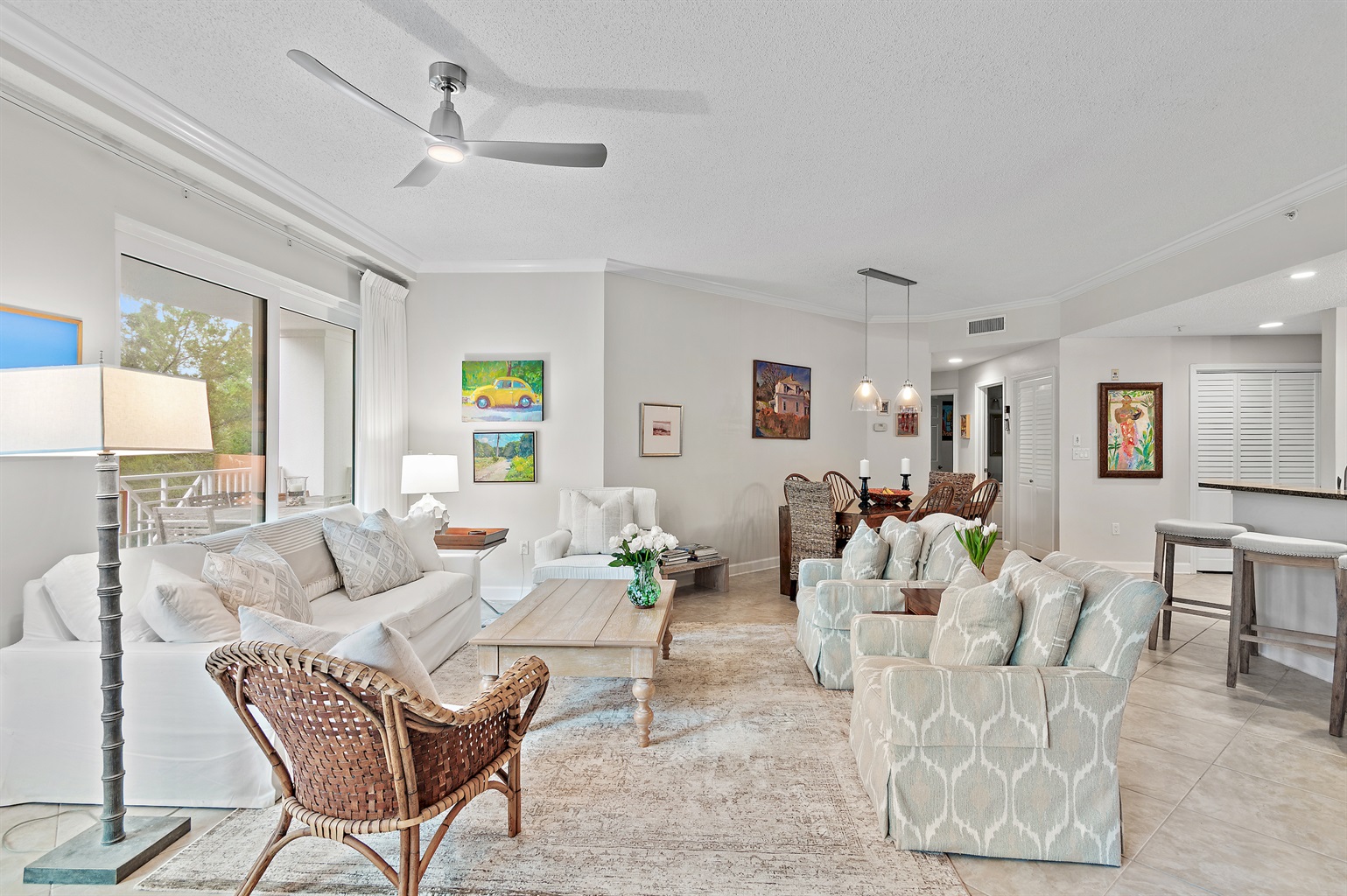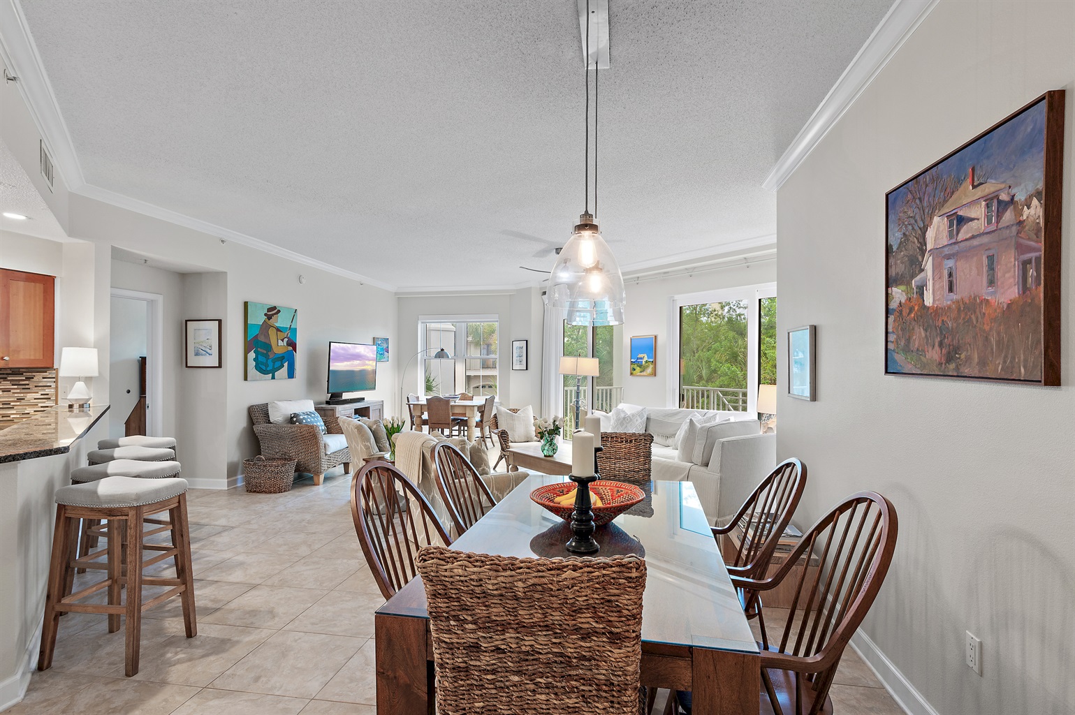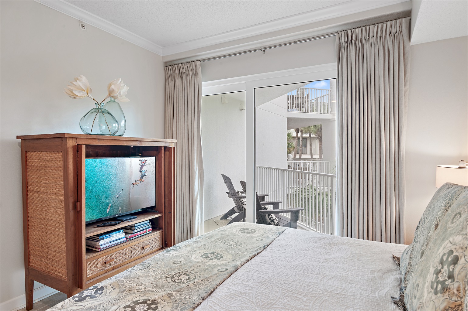 🏡 The Space 🛏️ Sleeps 7 comfortably • King Suite (private wing + jacuzzi tub + balcony) • 2 Queen Bedrooms • 1 Twin Bed 📐 Spacious Layout • 1,625 sq ft + large 400 sq ft balcony • Open living/dining with plenty of seating • Split floor plan = ideal privacy for families or couples 🌅 Outdoor Living • Main balcony with dining + lounge seating • Private balcony off primary suite